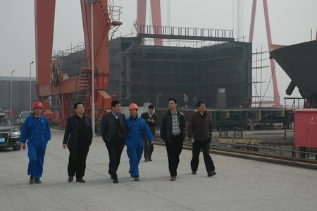 儀式結束后,管總一行實地考察了江蘇宏銘船舶有限公司生產經營情況,聽取了該公司負責人對43600噸散貨船建造情況的匯報,并就相關事宜進行了探討。管總強調,一是要按建造合同規定時間統籌規劃;二是要從廠方員工個人技術素質的提高和生產設施的完善著手,嚴把質量關;三是要加強公司監造人員與廠方的溝通和協調工作;四是要規范操作,確保施工安全。