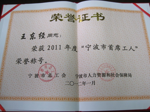 王東經船長被命名為2011年度寧波市首席工人