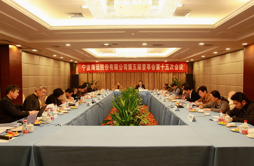 2012年3月23日上午,公司召開了第五屆董事會第十五次會議。會議由管雄文董事長主持,經與會董事認真審議、記名投票表決,一致通過了公司《2011年度董事會工作報告》、《2011年度總經理業務報告》、《關于2011年度募集資金存放與實際使用情況的專項報告》、《關于2011年度財務決算和2012年財務預算報告》、《關于2011年度利潤分配的預案》、《關于2011年度審計報酬事項的議案》、《關于續聘立信會計師事務所(特殊普通合伙)為公司2012年度審計機構的議案》、《2011年年度報告》和《2011年年度報告摘要》、《關于公司2011年度內部控制的自我評估報告》、《關于公司內部控制規范實施工作方案的議案》、《關于2011年度社會責任的報告》、《關于<寧波海運股份有限公司董(監)事薪酬及績效考核辦法(草案)>的議案》、《關于<寧波海運股份有限公司高級管理人員薪酬及績效考核辦法>的議案》》、《關于修改<公司內幕信息知情人登記制度>的議案》、《關于向金融機構申請授信額度及借款的議案》、《關于繼續為寧波海運集團有限公司銀行貸款進行擔保的議案》、《關于為寧波海運新加坡有限公司銀行貸款進行擔保的議案》、《關于公司向中國銀行間市場交易商協會申請發行本金總額不超過公司凈資產40%的中期票據的議案》、《關于對“明州3輪”予以報廢處置的議案》、《關于公司第六屆董事會董事候選人的議案》和《關于召開2011年度股東大會的議案》等二十一項議案。