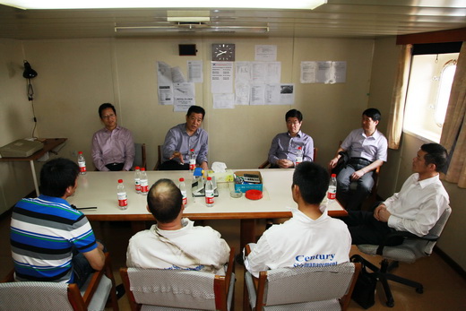 2012年5月9日上午,公司領(lǐng)導(dǎo)管雄文、褚敏、董軍、蔣海良、徐海良、傅維欽在相關(guān)職能部門(mén)及寧波海運(yùn)(新加坡)有限公司負(fù)責(zé)人的陪同下,前往靠泊在舟山老塘山五期碼頭作業(yè)的“寧波先鋒”輪,看望慰問(wèn)全體船員,并檢查指導(dǎo)工作。