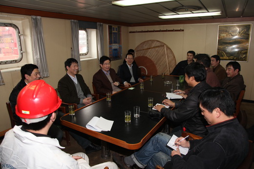 禇董事長一行與船上高級船員進行了座談,聽取了船舶生產、管理和船員生活等情況的匯報,對“明州20”輪所取得的成績表示肯定,對春節期間仍將奮戰在船舶一線的同志表示感謝。并對今后工作提出了要求:一是在嚴峻的航運市場環境下,要苦練內功,抓好貨運質量,盡最大努力為客戶提供個性化服務,不斷提升船舶市場形象;二是要加強船舶自修保養,保持良好的船容船貌;三是要抱著對公司、對家庭、對自己負責的態度,始終把安全工作放在第一位,嚴格各項操作規程;四是要繼續發揚“明州20”輪光榮傳統,凝心聚力,團結合作,展現寧波海運人良好的精神風貌;五是在中國傳統佳節——春節到來之際,船舶黨、工、團等組織要利用各自政治優勢,積極開展各類活動,營造溫馨和諧內部氛圍,保持船員思想穩定,確保船舶安全營運。